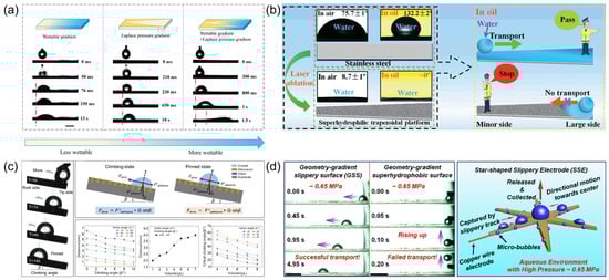 Mechanistic understanding has evolved in parallel with technological innovations. Recent theoretical models highlight multi-physical coordination as the cornerstone of system robustness. A prime example can be found in dual-lubricant interfaces, where interfacial tension gradients drive autonomous droplet motion. Quantitative analyses have shown that capillary forces dominate over viscous resistance, establishing a theoretical framework for complex-environment operations [43,53]. For extreme operational conditions, bioinspired gradient surfaces that integrate Laplace pressure modulation with surface energy control have demonstrated significantly enhanced bubble transport capabilities under high-pressure conditions, effectively overcoming the limitations of traditional superhydrophobic materials [20] (Figure 6d). In multiphase fluid handling scenarios, the interaction of wettability gradients and geometric confinement induced phase-separated droplet migration, while shear-thinning effects significantly enhanced micromixing efficiency [17].