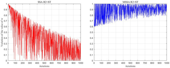The maximum number of iterations is set to 1000 in order to verify the effectiveness of the proposed adaptive weights . As shown in Figure 3, in the case of , it can be observed that the raw SSA decreases rapidly with the increase in the number of iterations up to 0.3. This indicates a sharp decline in the diversity of the original SSA population in later iterations, hindering the balance between global exploration and local search. However, the improved solves this problem well.
