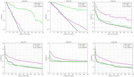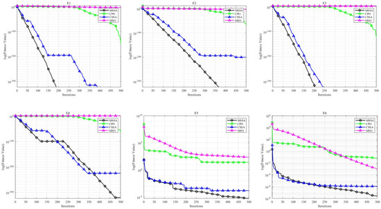 To further evaluate the performance of the improved MSSA, we selected the F1–F13 benchmark functions and conducted experiments in higher-dimensional spaces ( and ). The MSSA was compared with the original SSA and the ASFSSA, with the parameter settings consistent with those described earlier. As shown in Table 4 and Figure 6, MSSA achieves the optimal solution for the majority of test functions. Moreover, it exhibits a significantly faster convergence rate compared to both the original SSA and ASFSSA, which effectively validates the effectiveness and superiority of the proposed improvements in MSSA.