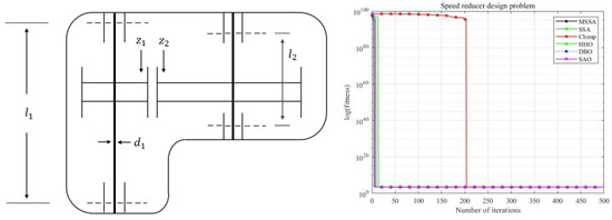 Speed reducers are indispensable components in mechanical systems, serving as core elements in gearboxes and finding widespread applications across various fields. In this optimization problem, seven variables are to be considered and the objective is to minimize the weight of the gearbox while satisfying 11 constraints. The image of the speed reduction design model and the iteration convergence curve are shown in Figure 11.