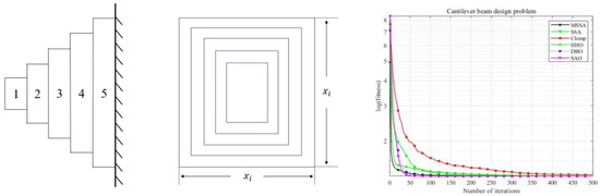 The cantilever beam design problem pertains to a structural engineering scenario wherein the primary objective involves the reduction or minimization of the weight associated with the cantilever arm. The cantilever beam arm depicted in the figure is rigidly supported at one end, with vertical forces applied to the free nodes of the cantilever. The beam comprises five hollow cells, each featuring a uniform hollow cross-section with variable height (or width) dimensions, and a constant thickness (here 2/3). The image of the cantilever design model and the iteration convergence curve are shown in Figure 12.