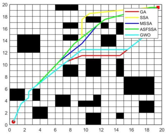 To validate the practicality of the improved algorithm, it is applied to route a 20 × 20 grid map and compared with GA, SSA, MSSA, ASFSSA, and GWO. The population size is set to 40, and the number of iterations is 100, with other parameters kept consistent.