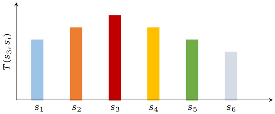 In general, reinforcement learning-based goal-oriented navigation methods typically begin from a given starting position and gradually explore the environment to approach the target position. However, when the environment is dynamic or the target is changing, these methods require a modulation of the reward function and retraining. Specifically, the value function in this work is decomposed into the state’s connection SR matrix and the reward function; the reward, independent of the SR matrix, allows for the rapid calculation of a new reward function. Figure 2 illustrates the schematic diagram of the SR value. Here, denotes the connection relationship between state and state s at time t. This work defines the connection relationship as the expected visit times from state to state s, represented as one column vector in SR matrix. In Figure 2, since the agent is currently in state , the SR values in adjacent states ( and ) are higher, indicating a stronger connection between state and its adjacent states. Consequently, the visit times to these adjacent states should be greater than those to non-adjacent states.