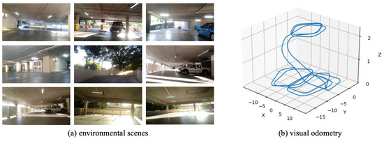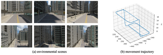 As a synthetic dataset, SynPerData is generated within a 3D urban environment featuring diverse architectural structures, road networks, and transportation infrastructure. The environmental scenes are depicted in Figure 3a. SynPerData comprises 4994 consecutive scene images. Figure 3b illustrates the groundtruth of the movement trajectory, clearly indicating that the camera’s trajectory is three dimensional.
