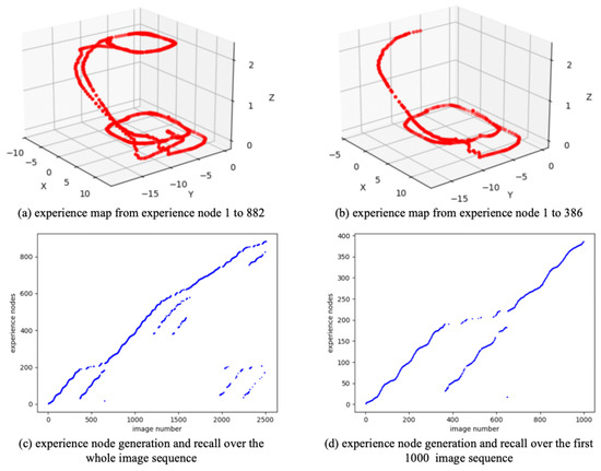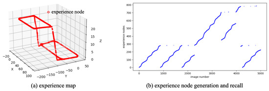 Initially, the 4994 consecutive scene images are input into the NeuroSLAM system, which derives the local view descriptors and self-motion estimates from sequential images. The pose cell network performs path integration through the coordinated processing of visual and motion cues. As scene images are continuously input, the NeuroSLAM system incrementally generates new experiences and inter-experience transitions. Figure 4a displays the results of the experience map built from SynPerData, showing that the topology of the experience map aligns with the ground truth of the movement trajectory. Figure 4b illustrates the generation and recall of experience nodes along the scene images, indicating that the constructed experience map contains a total of 786 experience nodes.