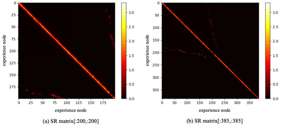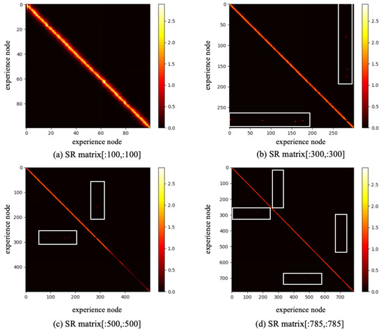 Based on the constructed experience map, several goal-oriented global path planning experiments were conducted. First, the adjacent selectable state nodes for each state node were extracted from the experience map, and the SR model was trained through reinforcement learning. During the training process, the information entropy is updated along with the training timestep. We have trained the SR model for 200,000 timesteps, and the change in information entropy is illustrated in Figure 5. It is evident that after training 100,000 timesteps, the information entropy stabilizes, indicating that the SR model has converged. Figure 6 presents the converged SR matrix, which details the transition weights among these experience nodes. Specifically, Figure 6a shows the heatmap of the SR matrix for the first 100 experience nodes, while Figure 6b,c displays the heatmaps for the first 300 and first 500 experience nodes, respectively. Figure 6d provides the heatmap for all experience nodes. In the figures, the white rectangle box indicates that there are interconnected experience nodes in that area.