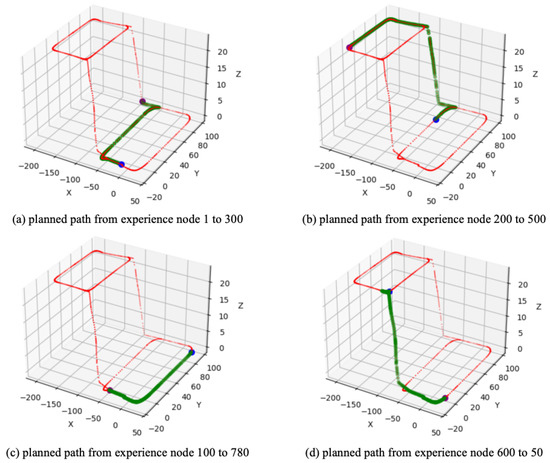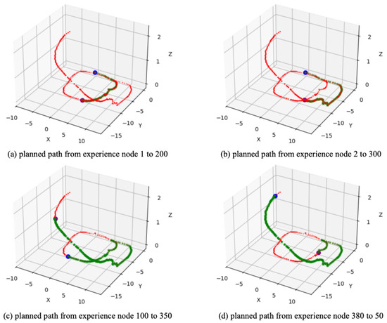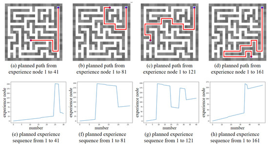 After the SR matrix is converged, different goal-oriented global path planning experiments are carried out. Figure 7a shows the planned path from experience node 1 (start point) to experience node 300 (goal point). It is clear that the planned path differs from the learning path; specifically, the planned path is a subset of the learning path. Similarly, Figure 7b,c present the results of global path planning from experience node 200 to 500 and from experience node 100 to 700, respectively. The first three experiments belong to forward planning, which are different from these; Figure 7d shows the planned path from experience node 600 to 50, demonstrating that our method is also effective for reverse planning.