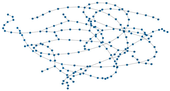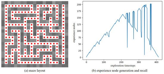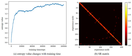 Furthermore, to verify the robustness of our method in a dynamic environment, the maze experiments were conducted. We first construct a maze environment, with its layout shown in Figure 13a. In this maze, the unoccupied areas are passable. Then, the Depth-First Search algorithm is utilized to enable the agent to fully explore the maze environment and return to the starting point. In Figure 13a, the red dots represent experience nodes, which are uniformly distributed in these unoccupied areas. Figure 13b shows the experience node generation and recall performance; the agent completes the exploration in 413 timesteps, and generates a total of 203 experience nodes. Due to the characteristics of the maze layout, path backtracking is inevitable. Based on the connectivity of the experience nodes, an experience node topology graph is constructed, as shown in Figure 14. The connections between experience nodes indicate path traversability. Based on the experience node topology graph, the SR model is trained for 100,000 timesteps. Figure 15a demonstrates the changes in information entropy value with training timesteps; it can be seen that the SR model has converged after approximately 50,000 timesteps. The heatmap of the SR matrix is displayed in Figure 15b.