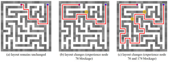 Moreover, we place obstacles in the maze environment, which block the previously traversable paths. Under such circumstances, the robot’s global planning ability is verified. Figure 17 describes the global path planning results in the changed maze environment, in which the blue dot represents the start point (experience node 1), the purple dot represents the goal point (experience node 100), the red line indicates the planned global path, and the yellow prohibitory mark represents the placed obstacle. Figure 17a shows the planned global path from experience node 1 to experience node 100. In Figure 17b, an obstacle has been placed at experience node 76, preventing the agent from reaching the goal along the previously planned path. Consequently, when the robot encounters a blockage, it can select its next experience node directly based on the SR matrix without the need to retrain the SR model. Similarly, two obstacles are placed at experience nodes 76 and 174 in Figure 17c. It is evident that the agent successfully plans an optimal global path to the goal despite these obstacles.