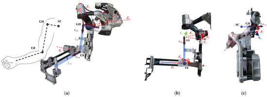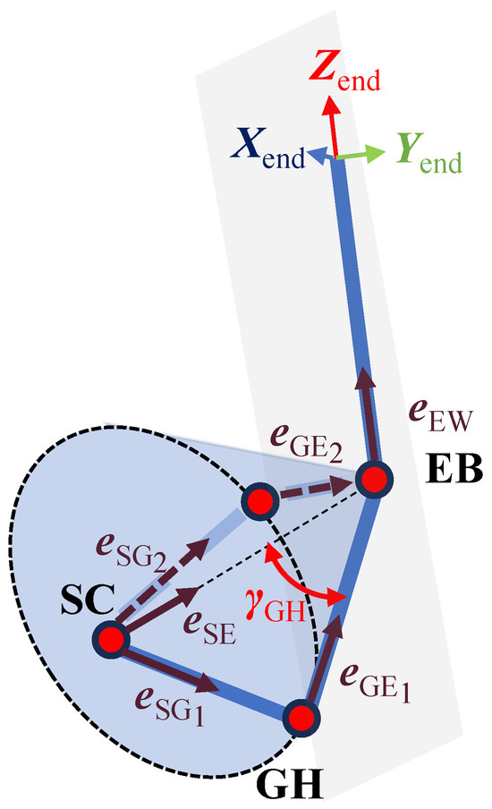 Owing to the alignment of the anatomical and robotic joint axes, along with the rigid human–robot connection, the orientations of the joints and links in the exoskeleton remain fixed relative to the vectors of the upper limb segments of the wearer. Consequently, given the vectors of the upper limb, the joint orientations of the exoskeleton can be determined, thereby defining the configuration of the upper limb exoskeleton. The vectors of the shoulder girdle, upper arm, and forearm are represented by , , and , respectively. The relationships between the orientations of joints and links in the exoskeleton and , , and are as follows: