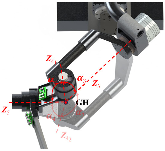 The human upper limb consists of multiple joints with a wide range of motion and flexibility. However, multiple joints present challenges in determining the degrees of freedom (DOF) arrangement for exoskeletons. The shoulder girdle alone comprises four joints [27], making it inefficient and unnecessary to replicate each joint’s motion individually in an exoskeleton. The movement of the shoulder girdle contributes significantly to the translational motion of the glenohumeral (GH) joint, particularly during elevation–depression and protraction–retraction. Studies have shown that the trajectory of the GH joint follows two circular arcs, with the distance between the axes of rotation deviating by less than 3 mm [28]. Based on this observation, the exoskeleton can use two orthogonal rotational joints to support the movement of the shoulder girdle. For the GH joint, which is a ball-and-socket joint, the exoskeleton can employ three intersecting rotational joints to mimic its motion. The elbow joint, which supports forearm flexion and extension, can be modeled as a single revolute joint with its axis perpendicular to the plane defined by the upper arm and forearm.