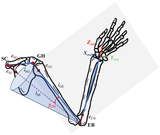 The upper arm, shoulder girdle and form a triangle and the angle between and is denoted as , as shown in Figure 3. is parallel to and perpendicular to the plane formed by and . can be solved using three constraints: