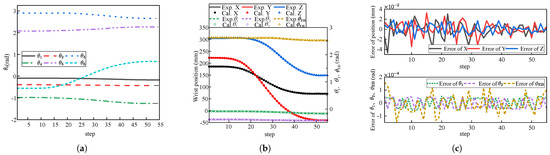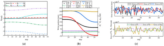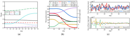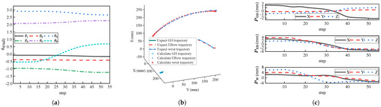 When the motion representation method is the end-effector pose, there are four different sets of IK solutions. A randomly selected set of results is displayed in Figure 7, where “EXP.” and “Cal.” in the legend stand for “expected” and “calculated”, respectively. The corresponding joint angles are shown in Figure 7a. Figure 7b illustrates the expected and calculated end-effector position and orientation, while Figure 7c presents the associated errors. The expected and calculated trajectories of wrist position and orientation aligned closely with each other. And the mean position error was approximately 0.018 mm and the mean Euler angle error was approximately rad.