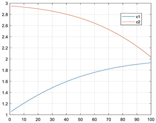The MRFO algorithm uses the parameter α to adjust the learning rate of individuals during the chain foraging phase, with the α value in each iteration shown in Figure 1. As can be seen from the figure, the range of α values extends beyond that of the interval [0, 1], and there is a high probability that it will be greater than 1. Therefore, at this stage, each individual tends to learn from the globally optimal individual, indicating that the algorithm is inclined towards global exploration. To enable particles in BPSO to learn in a similar manner, this section adjusts the learning factors c1 and c2, with their iteration curve diagrams shown in Figure 2. As can be seen from the figure, the value of c2 is greater than that of c1, which is beneficial for the algorithm’s exploitation. Both of them will change with the number of iterations. With the increasing number of iterations, the algorithm’s exploitation ability gradually weakens while its exploration ability gradually strengthens.