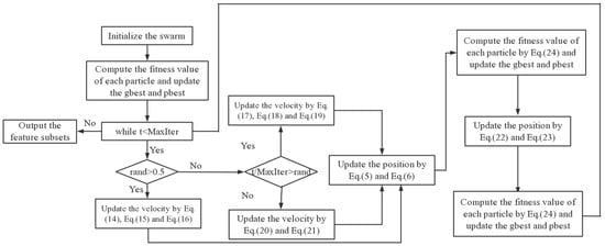 In recent years, binary particle swarm optimization (BPSO) has gained significant attention due to its conceptual simplicity, ease of implementation, and fast convergence. It has also been successfully applied to solve feature selection problems [14]. BPSO was proposed by Kennedy and Eberhart in 1997 [15]. PSO was converted into BPSO by using a transfer function that maps a continuous search space to a binary one. The updating process is designed to switch the positions of particles between 0 and 1 in binary search spaces. The goal of feature selection is to eliminate as many irrelevant and redundant features as possible. To achieve this goal, existing wrapper-based feature selection methods based on BPSO typically adopt an integrated fitness function that combines maximizing classification performance and minimizing feature subset size [16]. However, with an increase in data dimension, the search space of the feature selection problem grows exponentially. This leads to a problem that satisfactory feature subsets with some key features may not be found, as a large number of feasible feature subsets pose significant challenges to BPSO. BPSO algorithms often search too slowly to obtain good feature subsets. So, further improvements to the exploration and exploitation capabilities of the BPSO algorithm are needed.