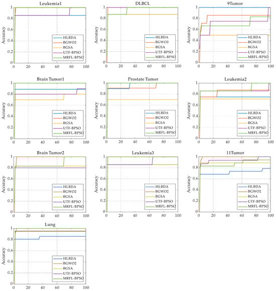 Figure 4. Convergence curves of the MRFL-BPSO algorithms and other comparison algorithms on each dataset.