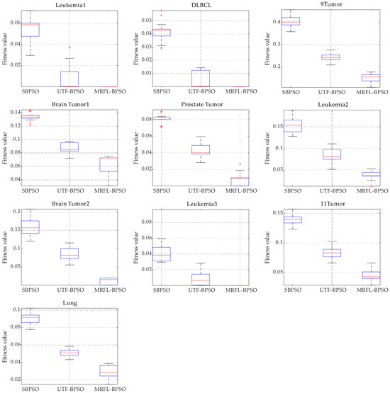 Figure 5. Boxplots of fitness values for MRFL-BPSO versus SBPSO and UTF-BPSO in dealing with the 10 datasets.