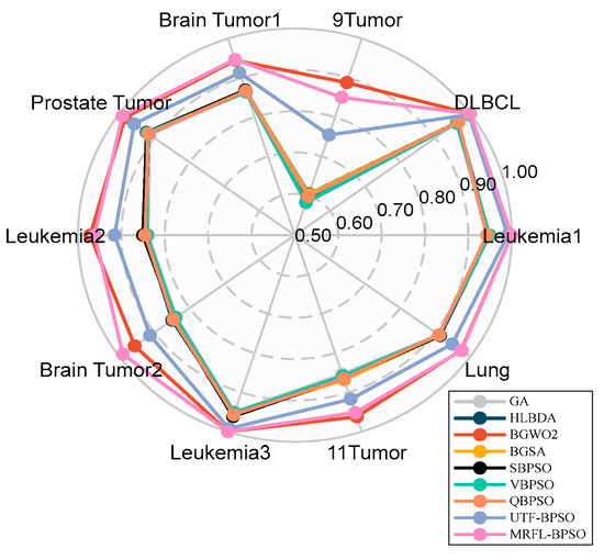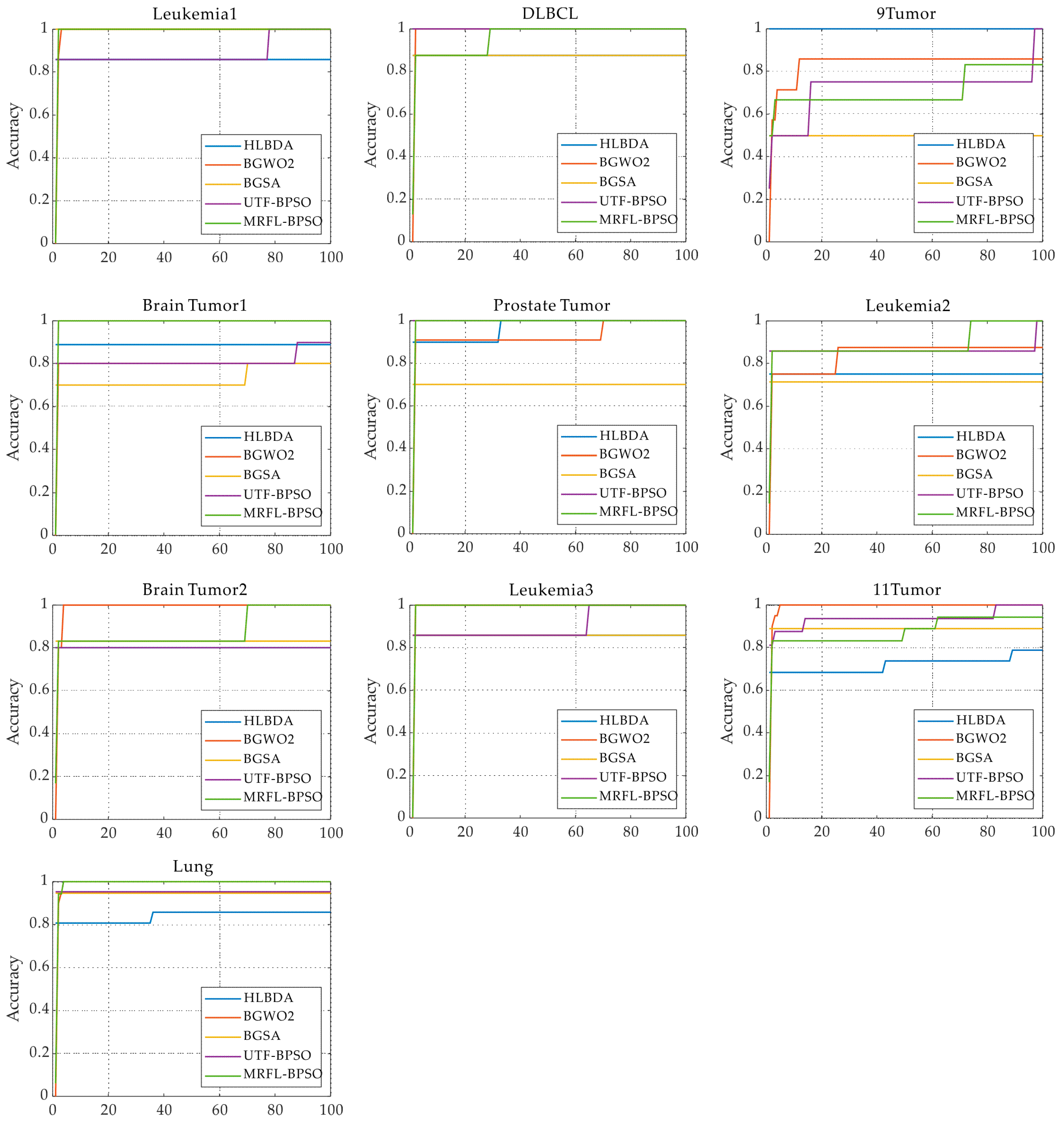 Figure 4 shows the convergence curves of BPSO-MRFL and several comparison algorithms. Each curve represents the result of 1 iteration among 20 runs. We plot the convergence curves of HLBDA, BGWO2, BGSA and UTF-BPSO and compare them with BPSO-MRFL. We chose HLBDA, BGWO2, BGSA, and UTF-BPSO because these algorithms have an average rank in the top five of the Friedman experiment. From Figure 4, it can be seen that the convergence curve of BPSO-MRFL significantly outperforms the other algorithms on most datasets, indicating that BPSO-MRFL has a better convergence ability. On the Leukemia1, Brain Tumor1, Prostate Tumor, Leukemia3, and Lung datasets, BPSO-MRFL has a fast convergence speed and achieves higher or comparable accuracy than the other comparison algorithms. On the DLBCL, Leukemia2, and Brain Tumor2 datasets, the convergence speed of the BPSO-MRFL algorithm in the early iterations is slower than that of other comparison algorithms, but it achieves the same classification accuracy as other the comparison algorithms in the later iterations. As shown in Table 6 and Table 10, the number of features selected by BPSO-MRFL on these three datasets is much lower than that of the other comparison algorithms. This all indicates that the chain learning and cyclone learning strategies enhance the algorithm’s exploration and exploitation abilities. In addition, we can also observe from Figure 4 that the somersault learning strategy allows BPSO-MRFL to jump out of local optima in the later iterations.