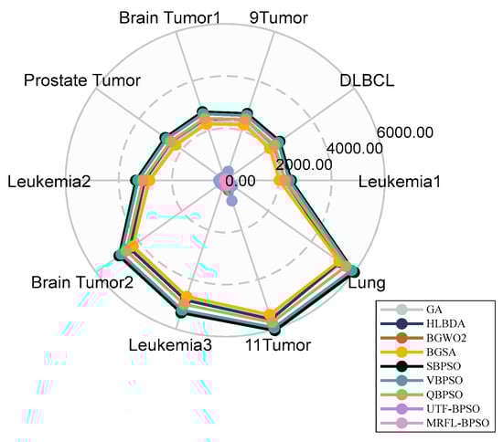 Figure 6 presents the average classification accuracy of MRFL-BPSO compared with other algorithms for the different datasets. As illustrated in Figure 6, MRFL-BPSO achieves superior classification accuracy over the other algorithms on the datasets except 9Tumor. For the 9Tumor dataset, while MRFL-BPSO is outperformed by BGWO2, it still maintains higher accuracy than the remaining algorithms. Figure 7 demonstrates the size of selected feature subsets obtained by MRFL-BPSO in comparison with other algorithms. The results reveal that MRFL-BPSO selects significantly smaller feature subsets than six algorithms (VPSO, SBPSO, QBPSO, BGSA, UTF-BPSO, and HLBDA), while yielding comparable subset sizes to the other two algorithms (GA and BGWO2). Therefore, these findings provide full evidence for the effectiveness of the MRFL-BPSO algorithm.