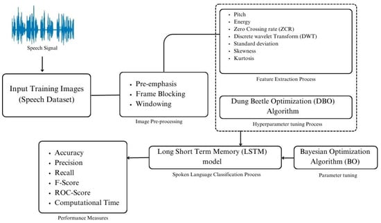 Figure 1 illustrates the workflow of the proposed DBODL-MSLIS technique to detect and classify multiple spoken languages using speech signals. It consists of following four key processes involved: preprocessing, feature extraction, Dung Beetle Optimization algorithm for hyperparameter tuning, and finally the LSTM-based classification. The features were extracted using Python (version 3.12.7; Python Software Foundation, Wilmington, DE, USA) within the Anaconda platform (version 2024.10-1; Anaconda Inc., Austin, TX, USA). The processing was carried out in Jupyter Notebook (Project Jupyter, Berkeley, CA, USA), using the Librosa (version 0.10.0.post2; librosa.org) and SciPy (version 1.14.1; SciPy Community, USA) libraries for feature extraction.