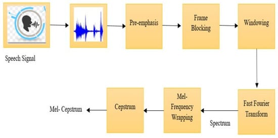 As a first step, the DBODL-MSLIS technique incorporates speech preprocessing, which includes a series of consecutive steps in the following order: pre-emphasis, frame blocking and windowing (Figure 2) []. The preprocessing phase involved cleaning and normalizing the audio data, converting speech signals into spectrograms, and extracting Mel-Frequency Cepstral Coefficients (MFCCs). This ensured the model was fed high-quality features, improving classification accuracy. The data were also standardized to have a mean of 0 and a variance of 1 to enhance training stability.