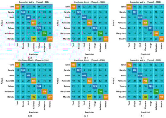 The performance validation of the proposed method is conducted using the benchmark IIIT Spoken Language dataset [] which comprises speech and textual data for the following Indian languages: Hindi, Bangla, Kannada, Malayalam, Marathi, Tamil, and Telugu. Each of the languages selected has over 10,000 articles on Wikipedia, ensuring a rich linguistic dataset []. It includes 7000 audio instances, evenly distributed across the seven language classes mentioned, with 1000 samples per language [,]. The duration of each speech segment ranges from 1 to 3 s. To filter out silent segments and enhance the quality of data, voice activity detectors were applied. Native speakers recordings are used in the data to ensure the dialectical authenticity and reliability [].