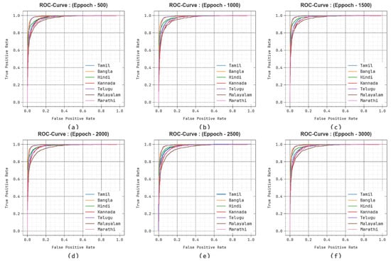 We have obtained the evaluation matrices such as accuracy, precision, recall, F-score, and the ROC curve for different epochs as shown in Table 1 and Figure 4. The results portrayed that the DBODL-MSLIS technique properly identified all the spoken languages. The best results are obtained with 1500 epochs, with average  of 95.55%,  of 84.46%,  of 84.41%,  of 84.34%, and  value of 90.91%.