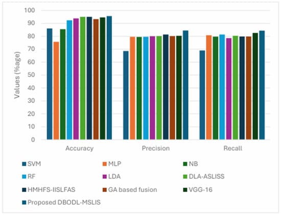 Finally, the proposed DBODL-MSLIS model combined LSTM and BO with Dung Beetle Optimization for feature selection. Its architecture included an input layer, followed by two hidden layers (64 and 32 neurons with ReLU activations), and a final softmax output layer. The model was trained for 3000 epochs with a learning rate of 0.001, demonstrating strong performance in optimizing hyperparameters and minimizing classification errors. The proposed technique accomplishes superior results with enhanced  of 95.55%,  of 84.46%, and  of 84.41%.