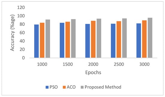Table 3 and Figure 10 illustrate the classification accuracy obtained by these methods over varying training epochs. PSO demonstrates moderate performance, with accuracy peaking at 83.45% after 1500 epochs and fluctuating thereafter. ACO exhibits more consistent improvement, reaching a maximum accuracy of 89.45% at 3000 epochs. In contrast, the proposed DBODL-MSLIS method, which integrates Bayesian Optimization with LSTM, consistently outperforms both PSO and ACO across all epochs, culminating in a highest accuracy of 95.55%. These results underline the robustness and effectiveness of the proposed model in enhancing spoken language identification through superior hyperparameter optimization.