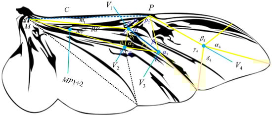 The Protaetia brevitarsis beetle was captured in Suqian City, Jiangsu Province, in July 2024. The wings of the dead beetle were cut from the wing roots and soaked in ethanol to observe the folding pattern of the hind wings. This beetle has good flight ability and aerodynamic characteristics [25,26,27]. As shown in Figure 1, the hindwing is mainly composed of wing veins, folding joints, and relatively soft membranes. During flight, the macroscopic morphology of the hind wings is maintained by a thick framework called the venation pattern. The wing root contains three thick main wing veins, namely the Costa (C), Radius Posterior (RP), and the MP1+2 branch veins of the Media Posterior (MP), which converge at the wing root point to form a middle bridge [28]. The driving muscles for wing folding and unfolding motions are concentrated at the wing roots, and complex-shaped skeletal muscle tissue can be observed. The wingtip of the hind wing is mainly supported by the leading edge frame, which includes two main wing veins and displays the folding pattern near the wingtip in a Z-shaped style [29].