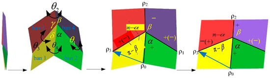 When all vertices are connected and form a closed loop, an additional condition is required so that all folding angles are determined and no folding interference occurs. As shown in Figure 2, in the four-angle single-vertex model (four-panel folding model) that can achieve planar folding, the angle transformation coefficients p between ρ0 and ρ3 are as follows: