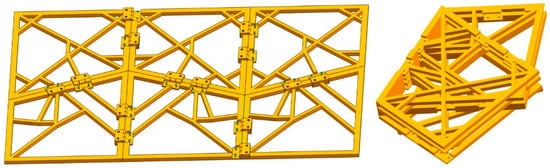 It can be seen that the folding motion between adjacent four panels follows the angular motion relationship of Formula (7). As long as the sector angles α, β, γ, and δ of each panel are determined, the sector angle values of the entire expandable panel mechanism can be calculated. Note that the biomimetic design of an equivalent double four-panel mechanism imitating the hind wings of beetles was first carried out, and the feasibility of folding motion was simulated and verified using ADAMS software. Next, the four-panel model is extended along the wing in spanwise and chordwise directions to construct a spatially deformable wing MAV. After calculation, the sector angles of the folding panel were determined (α = 75°, 85°, β = 80°, 60°, γ = 105°, 95°, and δ = 100°, 120°), and a double four-panel folding model was constructed as shown in Figure 3.
