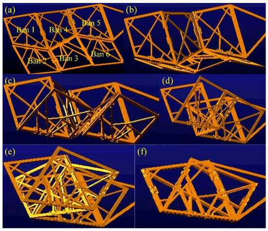 Folding process of biomimetic space deployable double four-panel mechanism. (a) Represents the fully unfolded configuration of the deployable mechanism; (b) Shows the folding motion at 0.5 s; (c) Shows the folding motion at 1.5 s; (d) Shows the folding motion at 2.3 s; (e) Shows the folding motion at 3.2 s; (f) Represents the fully folded configuration of the deployable mechanism.