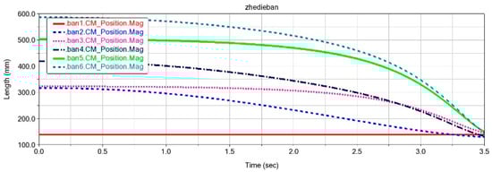 To verify the folding performance of the six panels (Ban 1-Ban 6), the ADAMS simulation process is shown in Figure 4. During the folding process, there was no mutual interference between the plates, and they were able to fold completely as expected. The centroid changes in each cardboard during the folding process are shown in Figure 5, and the cardboard completes the folding motion smoothly within 3.5 s. To analyze the structural response of the six-panel model during folding motion, its modal shapes are shown in Figure 6. The first mode of vibration is that the four corners of the thick panel undergo warping deformation. The second mode shape is the diagonal bending deformation of the thick panel in the opposite direction. The third mode shape is the bending motion of the thick panel folding mechanism at the connection of each panel. The fourth mode shape is caused by warping in the central region of the thick folding panel mechanism. At the fifth mode, a single corner undergoes warping motion. The sixth mode shape is the symmetric bending deformation of the outer edge of the folding panel mechanism. The modal frequencies of the first two orders are reasonable, and the design of the deployable mechanism is feasible, which enables the subsequent design of a deformable wing MAV composed of multiple thick panels.