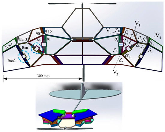 According to the design method of the six-panel folding model, the sector angle of each panel is calculated, and a spatial deformation wing model composed of multiple thick plates is constructed. Based on vertex V1, β1 (116°) is predetermined, and the sector angles of each folding panel are calculated sequentially as α1 = 64°, γ1 = 89°, and δ1 = 91°. The same calculation method is used for the angles of the four panels involved in vertices V2–V4. Due to the difference between thick plate folding and origami folding, the sector angles may differ by 2–3° when designing thick panel folding wings. Unlike the method of leaving characteristic gaps in the thick panel of the physical prototype in reference [32] to deal with interference phenomena that may cause penetration during the folding of thick plates, here, a step hinge is set at the lower end of the edge of the folded thick plate with a thickness equal to the sum of the thicknesses of the other two plates. The 3D model of the spatially deployable deformable wing MAV constructed after calculating all sector angles is shown in Figure 7. The folding motion of these thick plates follows the bistable mechanism of multiple four-plate mechanisms during folding motion.