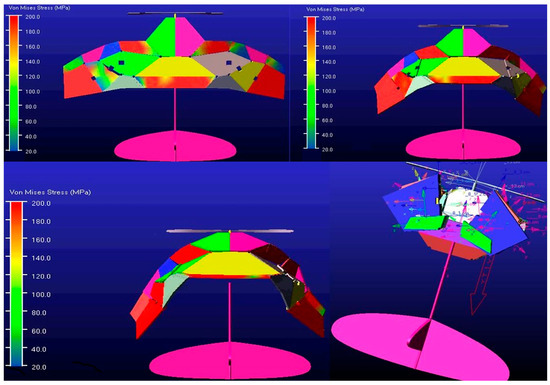 To investigate the structural performance of deformable wing MAVs under pressure loads, the load-bearing stability of the wing needs to be analyzed. The area of the entire wing surface in the unfolded configuration was measured using NX 12.0 software to be 74,553.8017 mm2. Based on the design goal of a physical prototype with a weight of 26 g [30], the pressure load applied to the wing surface was q = G/A = 0.348741 Pa. When the surface is subjected to a vertical upward pressure load, the directional deformation and total deformation of the wing can be obtained, and the entire wing surface must undergo gradual deformation as it moves away from the fixed end. In the total deformation shown in Figure 14d, the maximum deformation of the wing occurs at the wingtip, with a value of 0.32219 mm, which can be ignored compared to the wingspan of the wing. The total deformation of the wing exhibits good deformation coordination and is also analyzed in cambered and corrugated wings [26,37,38,39], which is an important consideration in the structural design of the wing. As shown in Figure 14b,c, the maximum deformation of the wing along the Y-axis and Z-axis directions is more pronounced after the wing surface is loaded. The maximum deformation along the X-axis direction is mainly manifested as normal bending deformation after being loaded, which radiates from the central region to the wingtip. This is because the hinge step is the main area responsible for the repeated folding and unfolding movements of the mechanism. The deformation of the wing in the Y-axis direction is caused by torsional motion after being loaded. Under specific pressure loads, the wing did not experience stress concentration or fatigue failure, indicating that the wing has good structural stability. As shown in Figure 14e, the development of the maximum equivalent stress (von Mises) is located at the root of the trailing edge of the wing because there are fixed supports on the connecting rods in this area. The surface of a wing subjected to aerodynamic loads is prone to fatigue or dynamic stress, and it is the first component of the wing to withstand tension under bending loads [40]. Therefore, the stress distribution on the wing after being loaded cannot be ignored in evaluating its structural performance.