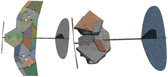 Modal analysis can help to gain a preliminary understanding of the structural response of airfoil dynamic changes before CFD analysis, which has guiding significance for analyzing the aerodynamics of deformed wing MAVs. In ANSYS Workbench, each thick panel (3 mm) is made of a foam plate with a modulus of 50 MPa, Poisson’s ratio of 0.38, and density of 30 kg/m3. The propeller and tail wing are set as fixed constraints. As shown in Figure 9, the grid size in the unfolded configuration is set to 4 mm, and the number of nodes and elements after meshing is 79,811 and 35,899, respectively. The grid size in the folded configuration is set to 1 mm, and the number of nodes and elements after meshing is 627,360 and 278,458, respectively. The area of the entire wing surface in the unfolded configuration was measured using NX 12.0 software to be 74,553.8017 mm2. The design objective based on a physical prototype [32] with a weight of 26 g was applied to a pressure load of q = G/A = 0.348741 Pa on the wing surface.
