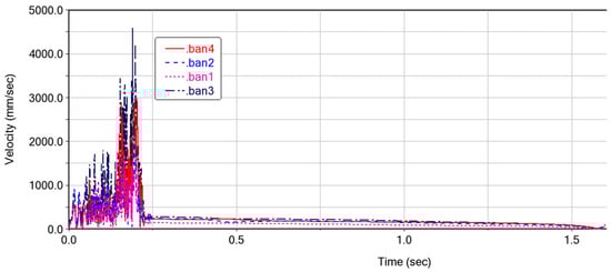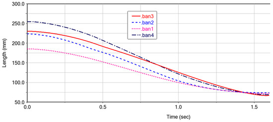 The motion pattern of each cardboard (ban1-ban4) during the folding motion of the expandable mechanism formed by vertex V4 is shown in Figure 10. It can be seen that the folding process is relatively smooth, with no intersection points on the curves, which also indicates that there is no penetration between each panel. After 1.5 s, the curves converge at one point, indicating that the four panels are completely folded and each panel is not adhered together. The speed variation of the cardboard during the folding process is shown in Figure 11. When the folding motion occurs during the first 0.25 s, the unstable folding speed is influenced by the bistable mechanism between the four-plate mechanism. There are multiple peaks in the velocity curve, which is due to the coupling connection between the four-plate mechanism and adjacent thick panels. The sudden inertial force phenomenon caused by the folding motion of a certain thick plate leads to the sudden fluctuation of the velocity curve. During the time period of 0.25–1.5 s, the folding motion changes smoothly, and there is no vibration phenomenon. The speed of the thick panel decreases gradually until the speed of the thick panel reaches 0, at which point the folding motion is completed.