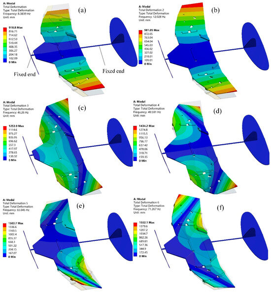 Modal analysis of the deformable wing MAV in deployed configuration. (a) The first mode of vibration; (b) The second mode of vibrations; (c) The third modal shape; (d) The fourth mode of vibration; (e) The fifth mode of vibrations; (f) The sixth modes of vibrations.
