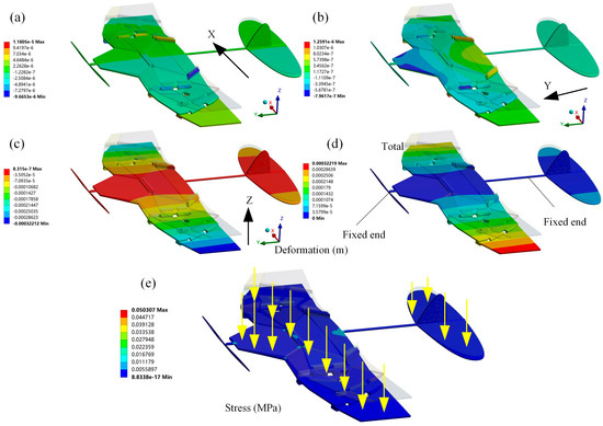 Static analysis of the biomimetic deformable wing MAV. (a) Deformation along the x-axis direction; (b) Deformation along the y-axis direction; (c) Deformation along the z-axis direction; (d) The total deformation under pressure load; (e) The equivalent (von Mises) stress under pressure load.