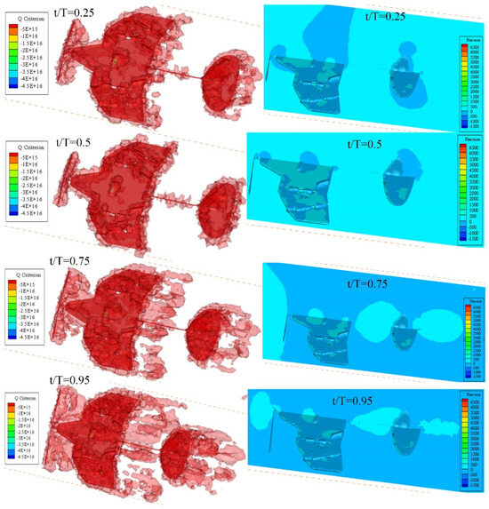Among the multiple rotation cycles of the propeller, one rotation cycle is selected for analysis. Tecplot 360 EX 2023 is used for post-processing. The vortex formations at t/T = 0.25, 0.5, 0.75, and 0.95 are shown in Figure 16, in which the vortex structures are identified by the iso-surfaces of the Q-criterion (Q = 20). The leading edge vortex (LEV), trailing edge vortex (TEV), and wingtip vortex (TV) continuously form a ring structure on the wing. The vortex passing through the trailing edge forms a circular vortex wake on the tail wing. The leading edge vortex and wingtip vortex are the main aerodynamic effects that generate lift and thrust in deformable wing MAVs. The wingtip vortex moves from the outer region to the center after generation, and during dissipation, the wake radius gradually increases and expands outward. At 0.5 T, the interference between vortices is minimal. However, at 0.75 T, vortices begin to merge and form a mixture of large-scale annular vortices and smaller debris vortices in the wake region. At 0.95 T, vortices gradually form and accumulate on the wing surface at the leading and trailing edges, with an increase in high-pressure areas on the upstream surface and low-pressure positions on the downstream surface. The rapid expansion of this fluid on the wing reflects the increased complexity of the flow field driven by the interaction between the induced flow caused by propeller rotation and the incoming flow [47].