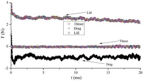 The aerodynamic force acting on the wing can be calculated by integrating the pressure and shear stress on the dorsal and ventral surfaces of the deformed wing MAV model. Then, by converting the total force into horizontal and vertical directions, it is easy to calculate thrust and lift [45]. The dimensionless lift coefficient (CL) and drag coefficient (CD) used for aerodynamic characteristics are defined in Formula (9). The three types of vortices formed by the fluid attached to the wing keep the pressure changes on the wing surface within a specific range, which enables the wing to produce reasonable aerodynamic characteristics during flight. The obtained lift, drag, and thrust curves are shown in Figure 17. After calculation, the average lift value generated by the wing over many cycles is 2.7 N. In other words, the air around the biomimetic deformable wing MAV will generate three strong types of vortices, producing enough lift to overcome its own gravity. The CFD simulation results provide important references for the design of lightweight twin-wing coupling for MAVs.