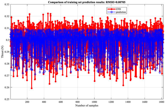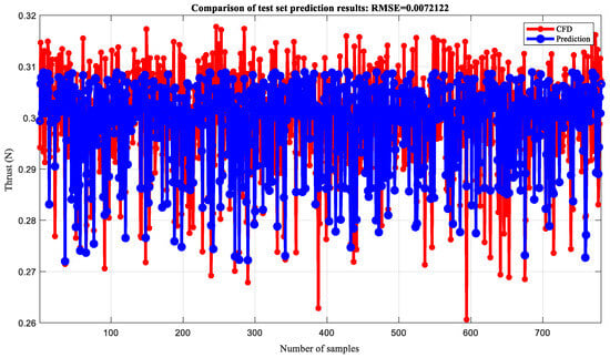 Based on thrust data of 0–0.5 T, a wavelet neural network is established to simulate and predict thrust, and the training and testing sets are divided in a 7:3 ratio. Firstly, the offline neural network fitting simulation was validated. The neural network is set to three layers, with 11 neurons in the hidden layer, a learning rate of 0.1, and an upper limit of 1000 training iterations. After network training, 100 sets of data were used as the validation set for testing the model fitting results. The comparison of training set prediction results is shown in Figure 19 (RMSE = 0.0067924). This indicates that the difference between predicted and true values of the model is small, so the model has a good fitting effect and high prediction accuracy. The comparison of the predicted results of the test set is shown in Figure 20 (RMSE = 0.0069812), which indicates that the model has a good fitting effect and high accuracy.