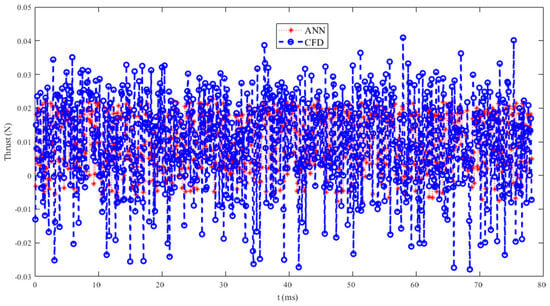 To quantitatively evaluate the simulation effect of the wavelet neural network model on thrust, as shown in Table 3, the correlation coefficient (R2), mean absolute error (MAE), mean relative error (MBE), and root mean square error (RMSE) of the training and testing sets were compared and analyzed. It can be seen that the R2 of the training set and the test set are close to 0.6, indicating a strong positive correlation between the predicted values and the true values. The fitting effect of the model is good, with MAE, MBE, and RMSE all close to 0, and the maximum not exceeding 0.001. Overall, the model fitting error is small and can be applied to the prediction of actual thrust, providing a certain reference for the trend changes in thrust data. The thrust prediction for the next time step is shown in Figure 21, and it can be seen that the trend in the simulation results is similar to that of the prediction results, which once again demonstrates the feasibility of using neural networks to predict the aerodynamic performance of deformed wings.