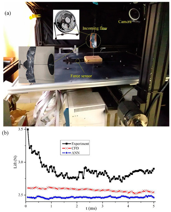 Lift characteristics of the deformed wing MAV (α = 5°) obtained from experiment, numerical simulation, and network prediction. (a) The motion capture system is used to measure lift characteristics; (b) Comparison of measurement results of motion capture system, calculation results of ANSYS Fluent, and prediction results of artificial neural network.