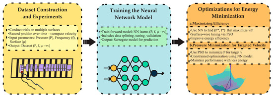 To reduce the input pressure required to achieve a target velocity , an adaptive optimization strategy is employed. While the relationship between pressure , frequency , surface friction , and resulting velocity can be approximately linear in certain scenarios, it often exhibits strong nonlinearities and material-dependent variations. These complexities make analytical inverse modeling intractable for general cases. Therefore, a data-driven approach is adopted, using Particle Swarm Optimization (PSO) in conjunction with a trained neural network surrogate model. This model efficiently predicts the system’s response to actuation parameters, enabling optimization without requiring a closed-form analytical solution.