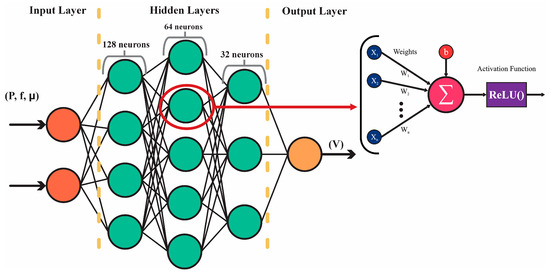 In this study, a feedforward neural network (FNN), as illustrated in Figure 4, is employed to predict the velocity of a soft inchworm robot based on input frequency, actuation pressure, and the surface friction coefficient. These inputs are used to capture the influence of control parameters and environmental interaction on locomotion dynamics. The output of the model is the robot’s resulting velocity. Due to the inherently nonlinear relationships between these parameters, a neural network model is selected for its ability to model complex dependencies with computational efficiency. The neural network architecture comprises three hidden layers with Rectified Linear Unit (ReLU) activation functions, enhancing learning capability and addressing vanishing gradient problems [37]. Dropout regularization is applied to the first hidden layer to reduce overfitting and improve generalization. Six configurations were tested, combining two different numbers of neurons in the first layer (128 and 32) with three dropout rates (0, 0.1, and 0.2). The results indicated that a larger number of neurons in the first layer (128) combined with a dropout rate of 0.1 yielded the best performance, as detailed in Table 5.