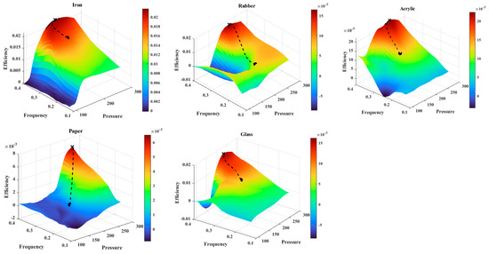 Efficiency surfaces for different materials (iron, rubber, acrylic, paper, and glass). The color intensity represents efficiency values, with higher efficiency shown in warmer colors (red) and lower efficiency in cooler colors (blue). The dashed black line represents the PSO trajectory, which optimizes efficiency by adjusting pressure and frequency. The black dot marks the starting point, and the black cross indicates the optimal solution found by the algorithm.