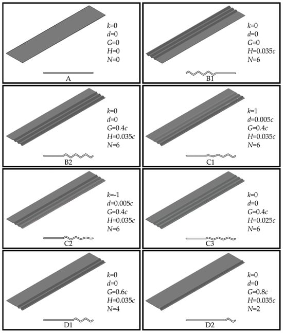 In this paper, we study a flat plate wing and seven corrugated wings with different corrugation configurations. All model wings feature a rectangular planform and an aspect ratio AR = R/c = 5. Here, R refers to the wingspan, while c denotes the chord length (c = 10 mm in this study). This aspect ratio approximates the average value observed in dragonfly forewings [28]. To isolate the aerodynamic effects of the corrugation structure, all model wings maintain a uniform thickness of 0.02c. As presented in Figure 1, the flat plate wing is labeled as A, while the seven corrugated wings are labeled as B1, B2, C1, C2, C3, D1, and D2.