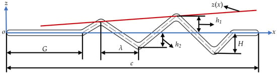 The corrugation structures for the corrugated wings are based on the triangular wave model proposed by Rees [29]. Specifically, the corrugated structures of B1 and B2 are positioned near the leading and trailing edges of the wing, respectively. The corrugation amplitudes of wings C1 and C2 increase and decrease toward the trailing edge, respectively, with both wings having the same mean amplitude value. Based on B2, the amplitude is further adjusted to create C3, whose amplitude value is equal to the average value of C1 or C2. Wings D1 and D2 are created by reducing 2 and 4 triangular wave structures, respectively, based on B2. As illustrated in Figure 2, to parameterize the corrugated structure more conveniently, the midline of the cross-sectional profile of the corrugated wings is given by the equation for z(x):